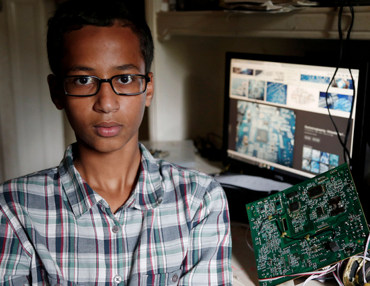 The winners: Ahmed's Sudanese parents, who ordered pizzas for the horde of media outside their house; Ahmed, who won online support, praise for his advice to other brainy kids to "go for it," and invitations from the White House, Twitter, Facebook, NASA, scientific and engineering organizations, and a bunch of STEM-oriented schools, including M.I.T., his "dream school"; the media who dug up stories about all the other you'd-think-suspicious classroom inventions - lemon battery, potato clock, baking soda volcano, and a nuclear reactor built by another 14-year-old (white, obviously) - that earned their creators acclaim and support, not handcuffs; and the Internet, which lit up.
