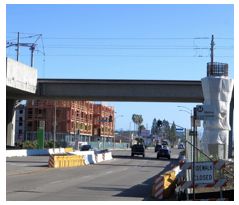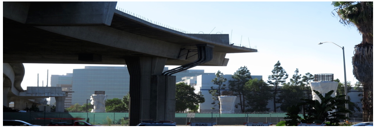 That “stub of missed opportunities” is now punctured with steel rebar skeletons for the concrete columns that will eventually support the Green Line when it finally travels north and arrives near LAX – where it should have gone back in 1991.