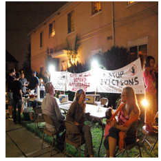 This evening the potluck has attracted around 25 protester-partiers, who drink beer on the sidewalk or eat at one of the cafeteria tables that stretch along the lawn. They include residents from the 43-unit Cove Apartments on nearby Commonwealth Avenue, who are also under Ellis evictions, following the Cove’s sale last May to the Robhana Group real estate investment firm.