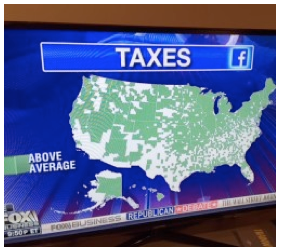 POLITICAL SILENCE--In Tuesday night’s Republican Debate in Milwaukee a graphic was displayed to show where Facebook activity occurred discussing taxes. The green shaded areas on the graph indicated areas and states that had Above Average chatter on taxes (whatever average is.)