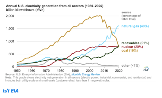 CommentsTHE GRID - The Energy Information Administration, the primary authority in the federal government on energy numbers, concludes that renewables, primarily hydro, wind and solar, rose to become 21% of electricity generation in the U.S. in 2020.