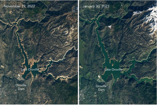 Satellite images show how January storms boosted water levels in parched Lake Oroville, one of the state’s largest reservoirs. State officials released water from the reservoir this week in anticipation of another major storm. Photos via NASA Earth Observatory