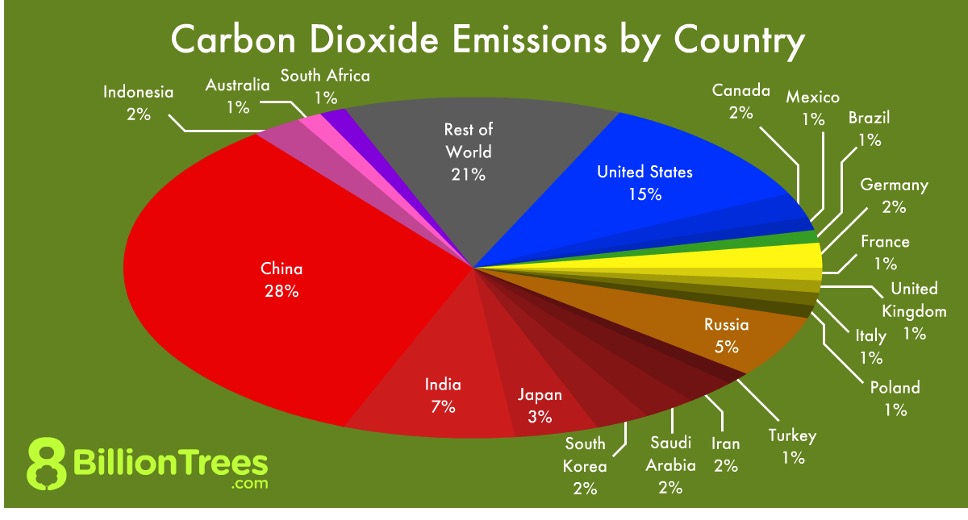Differences between countries: When we compare carbon dioxide emissions at the country level, we learn that China (28%) and the United State (15%) are the planet’s largest emitters.