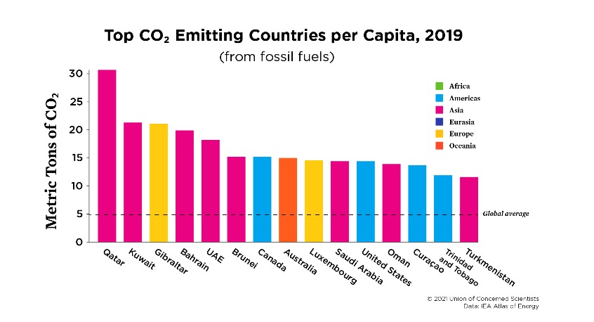 When we compare the per capita CO2 emissions of different countries, the results are strikingly different. China completely disappears from the chart, and the United States ranks 11th, behind such Persian Gulf fossil fuel producers as Qatar, Kuwait, and Bahrain. Clearly, humans, have very different carbon footprints based on their nationality.