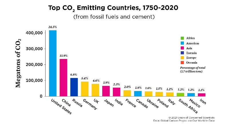 Next, when we examine GHG emissions by country over time, a totally different picture emerges. Historically, the largest CO2 emitter, the United States, has 4 percent of the world’s population but has produced 24.5 percent of all CO2 emissions. In second place, China has 18 percent of the world’s population and has emitted 14 percent of global CO2. This means that the carbon footprint of Americans is, on average, at least four times larger than a typical resident of China.