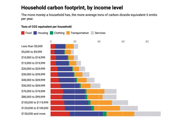 These data should not be misconstrued, however, because US residents are not equally responsible for the CO2 emissions that drive climate change. There are different tremendous differences in the per capita carbon footprint of distinct income groups. Households whose income is over $150,000 per year generate four times the amount of CO2 as households whose income is less than $5,000 per year. This, of course, makes total sense. Families that live in a McMansion with 24/7 heating and air conditioning and also drive several high performance cars, use much more energy and generate far more CO2 than low-income families. The latter typically live in apartments and rely on public transit, not private cars, for mobility.