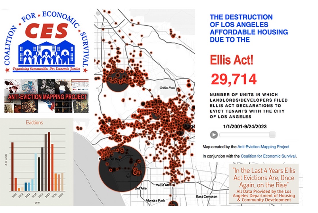 - Evictions: Legal evictions are increasing in Los Angeles as the Covid 19 Pandemic relief programs wind-down. According to the Los Angeles Times, despite new tenant protections, local landlords filed 46,000 eviction cases in 2023, the highest number in a decade. Furthermore, under-the-table evictions, politely called cash for keys, have continued. When done legally through the Ellis Act, the Coalition for Economic Survival has documented 29,714 cases since 2001. The number of Non-Ellis Act evictions, when landlords bribe tenants to disappear, are unknown.