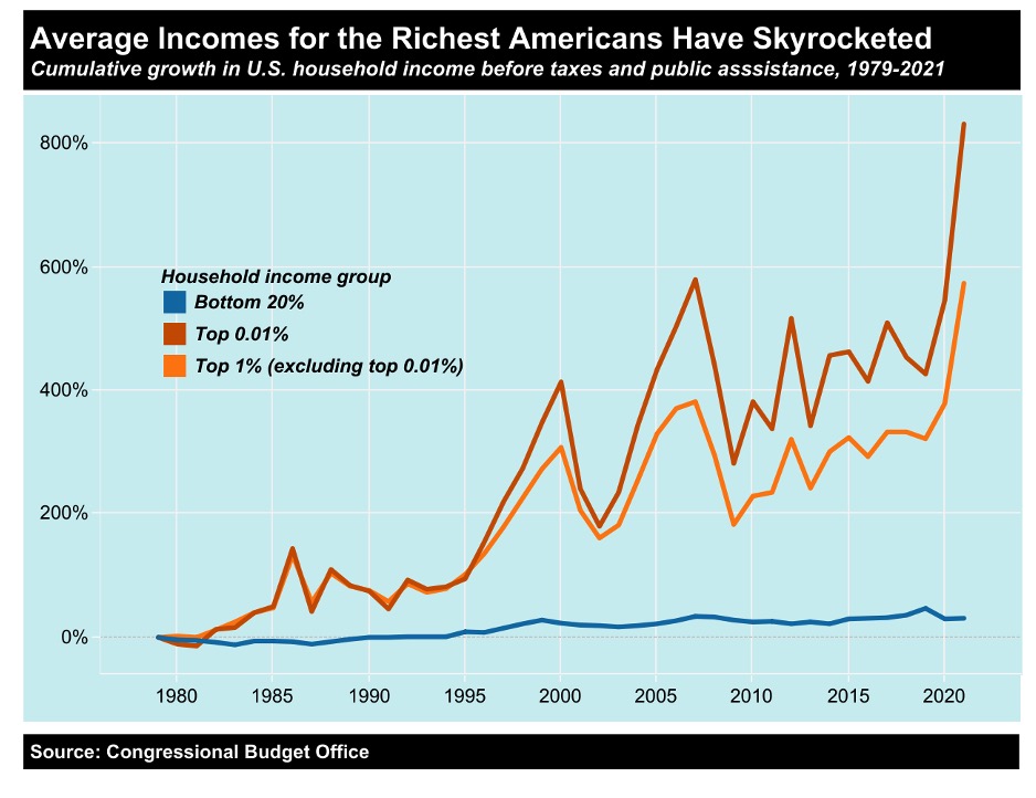 To better understand this vast accumulation of enormous wealth at the very top, like Musk’s, we need to realize that most of it has appeared since 1980. The fortunes of the top .01 percent increased by 800 percent in this period. The rest of the population were stuck in place because of inflation.