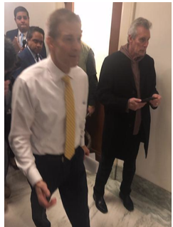 In line with his pattern of shooting blanks, Congressman Meadows quizzed Michael Cohen about an omission on his disclosure form, related to allegations of foreign lobbying hoping to establish a perjury trap. However, freshman LA-based Congresswoman Katie Hill (CA- 25) muzzled that yapper graciously and expeditiously. She informed Congressman Meadows that, “The question is in fact whether witnesses have any contracts or payments originating with a foreign government. It does not cover all foreign entities.” Extending his pattern of odd and puzzling questioning, Mark Meadows tried to land a three-pointer but failed miserably. (Photo left: Congressman Jim Jordan storming out of committee hearing. Photo by Sara Corcoran.)