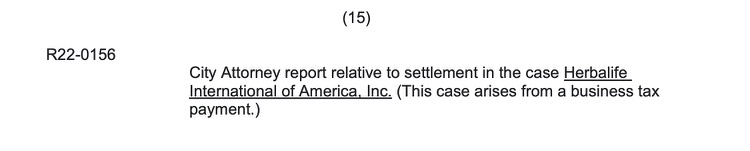 When I asked the City Attorney, why there was an item 15 on a Claims Board Agenda that identified Herbalife in some kind of settlement, he said: