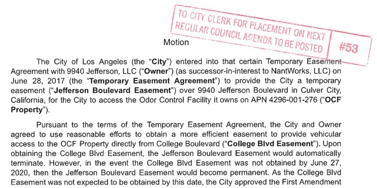 The City of Los Angeles (the “City”) entered into that certain Temporary Easement agreement with 9940 Jefferson, LLC (“Owner”). That address was familiar to me, so I clicked on the item.