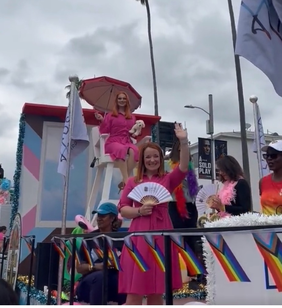 The current Third District Supervisor has attracted a drag performer who dresses in the same fashion she does. This is a big compliment! No word if the Supervisor compared notes, or if the drag performer, spots the Supervisor early in the parade and then jumps into action. Lindsay Horvath is an active celebrant of LGBTQ+ rights.