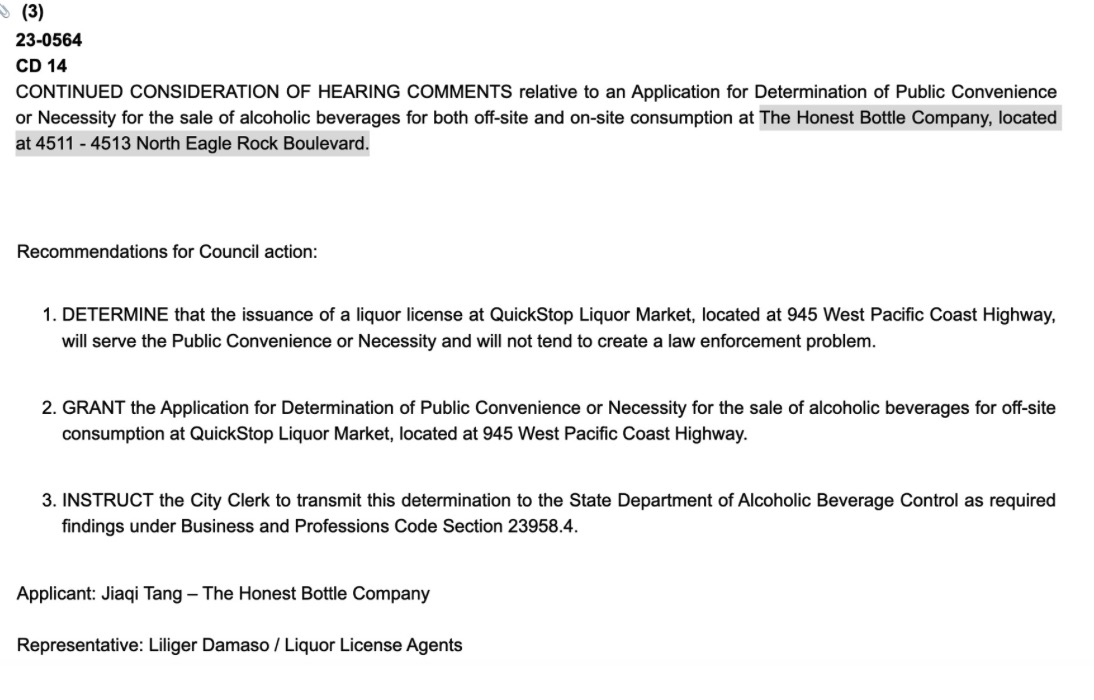 By the way part two -- right in the neighborhood — Please check on item three, because you've got a necessity and convenience request for a liquor license for The Honest Bottling Company in Eagle Rock but somehow granted the application for determination to QuickStop Liquor on the West PCH. That's a mistake.