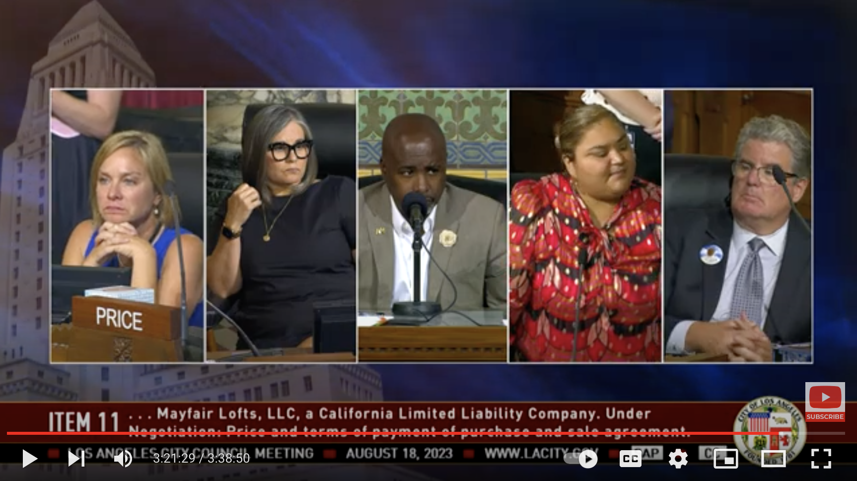 Smart Speaker Thanks, it's Eric Preven, I think the Mayfair Hotel deal needs to be slowed down and lights turned on. Isn't Miguel Santana, the former CAO, running Weingart? And I take note of Blumenfield's comment that 11 million dollars were paid to this hotel to fix it up following the Project Room key. So paying twice... that's a disgusting detail, and the explanation about how you can keep the insurance payout and never fix your car... is not comforting. This is housing, Blumenfield. They ought to put the $11 million dollars into the repairs, or "on the screen" as we say in the movie business.