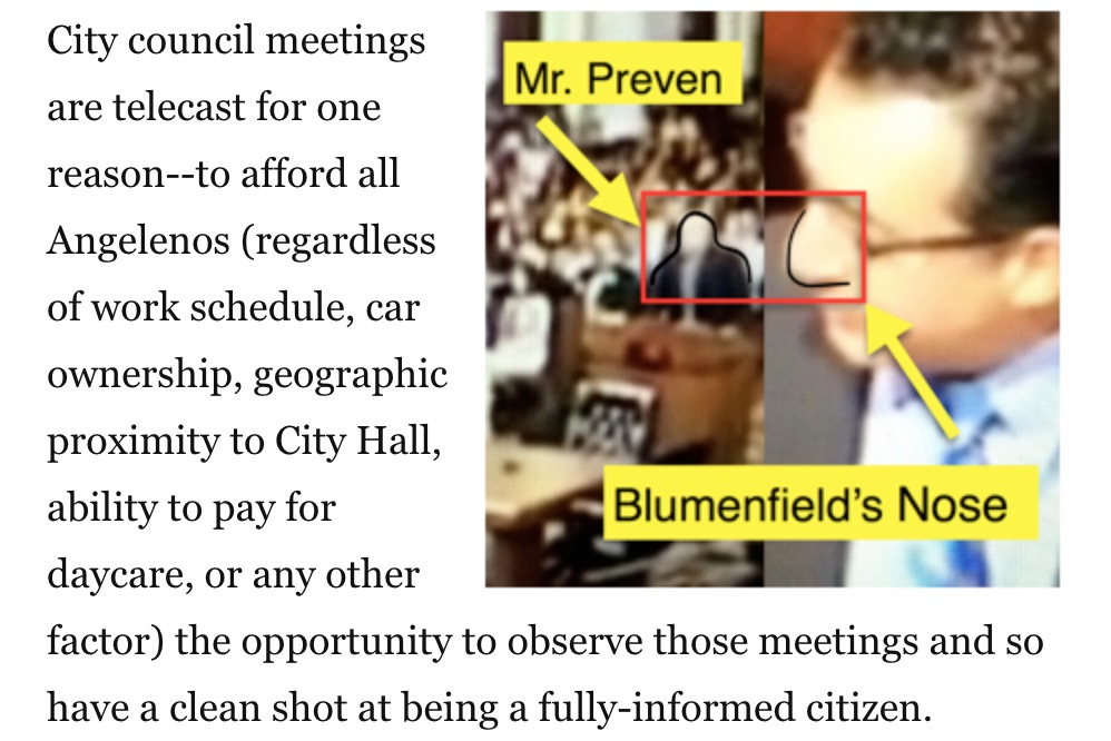Channel 35 is taxpayer-funded so it's the public who owns the cameras, microphones and gavel with which Mr. Krekorian presides over City Council meetings. And it's not acceptable for them to be given a telecast in which those of their fellow Angelenos who made the considerable effort to contribute a public comment in person are barely visible, while the members of the Council are without exception presented in full close-up-- a fact that has not gone unnoticed by certain candidates currently running for office.