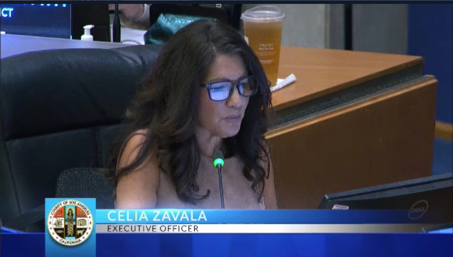 County Executive Officer in a flesh-colored outfit with a single-use plastic bottle behind her.