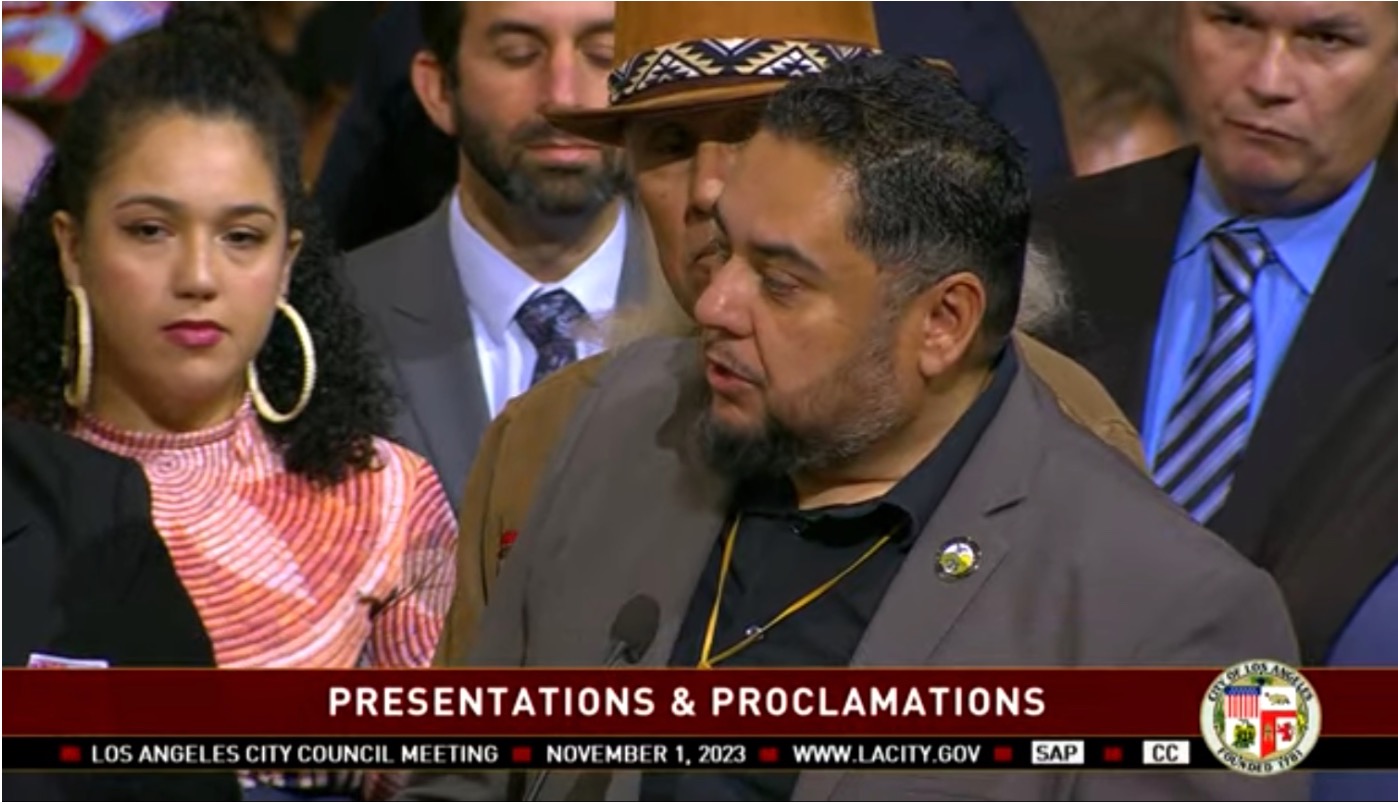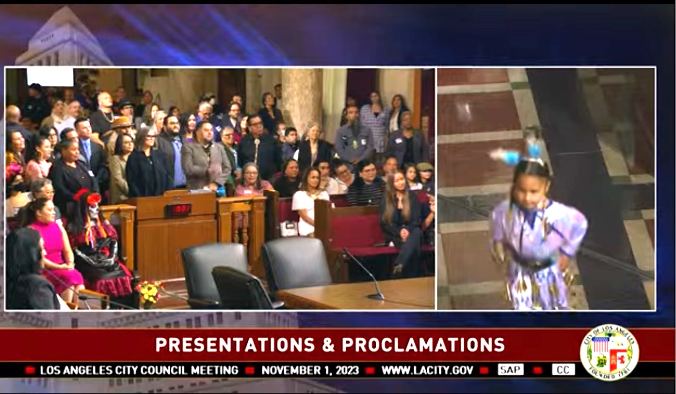 I think it was Traci Park who said, “That’s a tough act to follow”… after the tiny dancer - who was fabulous. Hats off, if that’s appropriate to the entire Dia de los Muertos recognition group. And it’s interesting because I wrote about Rudy Ortega — you can call me prescient, Fauble, just don’t interrupt me — and today Rudy showed up. He’s the Harvard Westlake Tailgater who sold the Studio City indigenous people down the river… highly irritating.