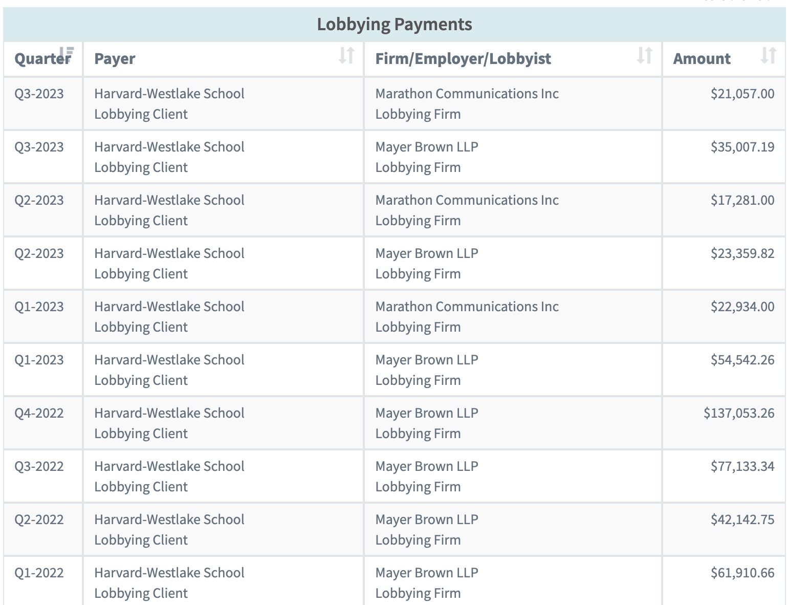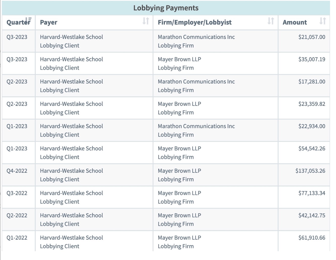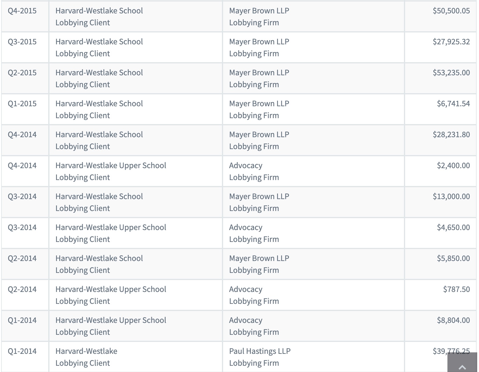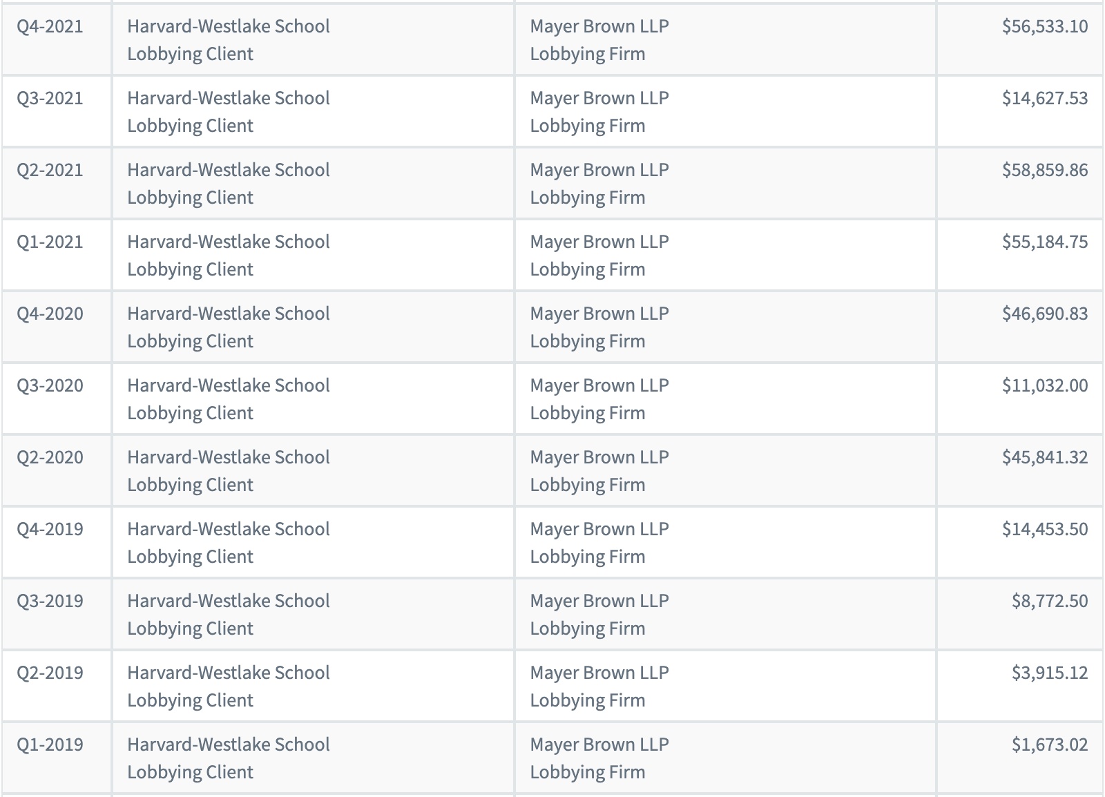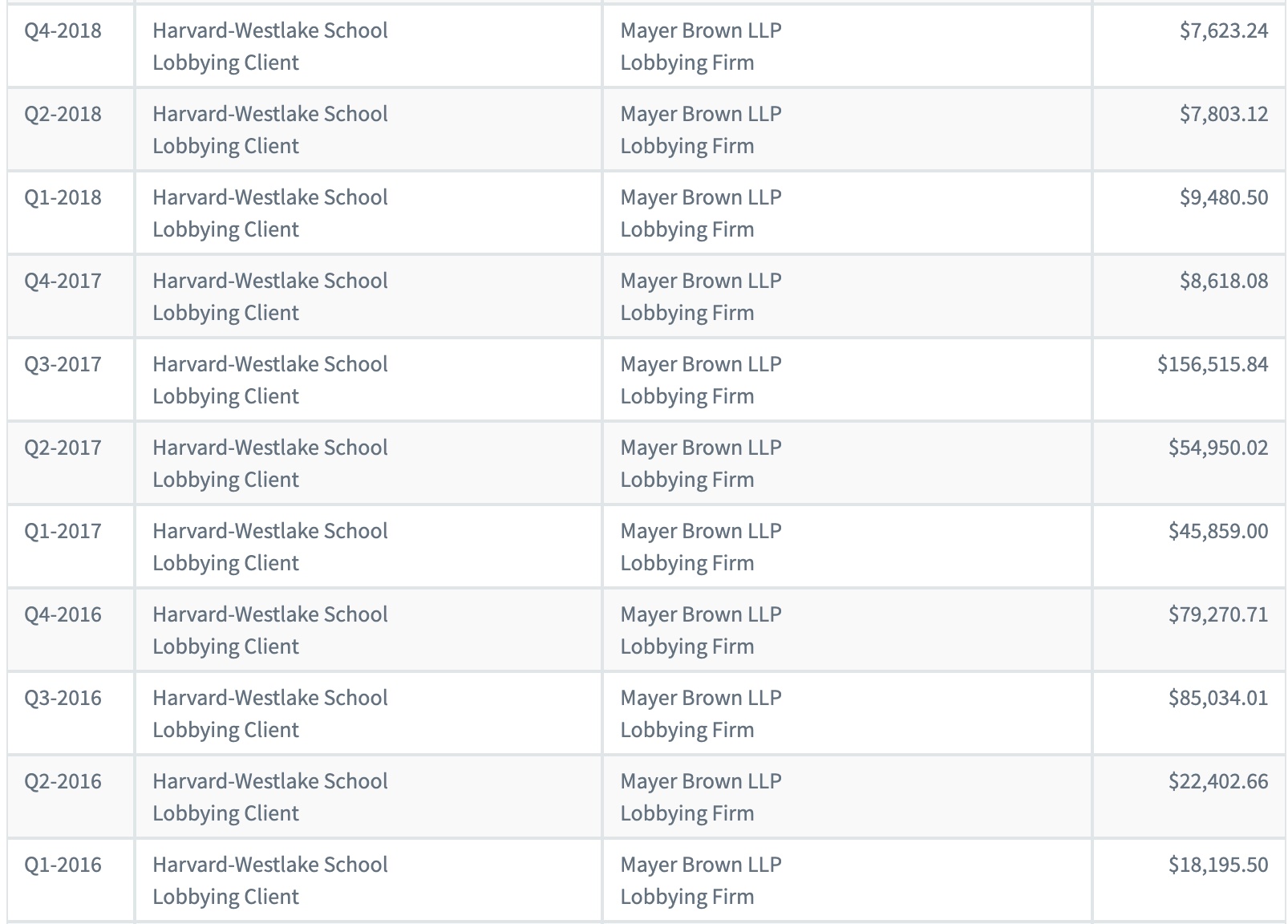 Harvard-Westlake spent more than $2,089,627.11 lobbying over about a decade including both great switcheroos.