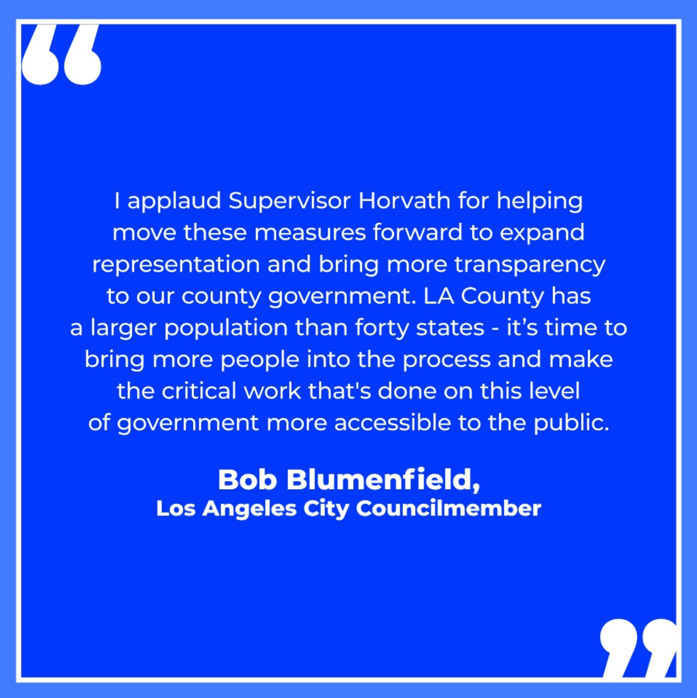 Lindsey Horvath, County Supervisor SD3:...Good government is one with checks and balances which is why the third key component is ethics reform. This includes creating an independent ethics commission to increase transparency and build public trust. The independent Ethics Commission will enhance accountability and integrity within the county's governance, holding our elected representatives to the highest levels of ethical conduct with protocols to root out corruption. The proposal also creates a publicly searchable lobbyist database and extends the revolving door policy to prevent county officials from lobbying the county until two years after leaving their service.  This reform package also requires open budget hearings by departments each year, because our communities deserve to know how their tax dollars are spent and how our 46 billion dollar budget directly impacts them.