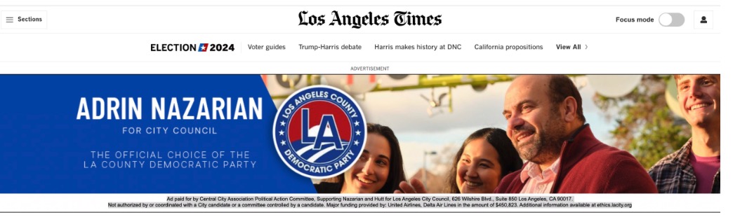 If you’ve scanned the LA Times lately, you may have noticed ads from the Central City Association PAC, sponsored by heavyweights like United and Delta Airlines, backing candidates such as Adrin Nazarian and Heather Hutt. While these ads technically claim “independence,” United’s lobbying adds another $150,000, targeting LAX policies like leaseholds, terminal access, and city policy to secure prime business interests.