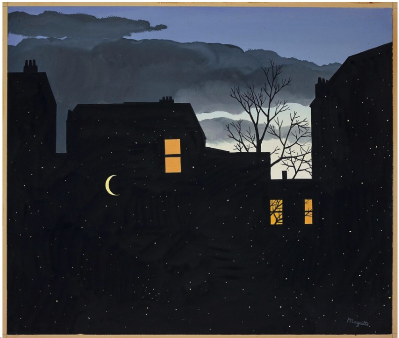 "Les Poison" by Rene Magritte, 1939, the first in his L'empire des lumières series, boldly merges day and night—a haunting theme he revisited for over a decade.