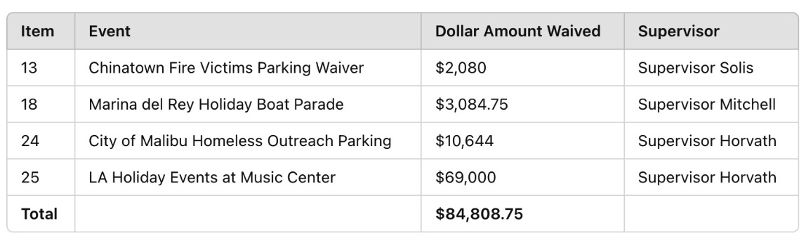 The Los Angeles County Board of Supervisors has approved a $10,644 parking fee waiver for The People Concern (TPC), Venice Family Clinic, and Department of Mental Health (DMH) staff at Zuma Beach, supporting year-round outreach to Malibu’s unhoused population. However, the Board or the Department of Beaches and Harbors should verify whether the stated parking rates accurately reflect current fees. If rates have increased, the estimated waiver total may be significantly underestimated, raising questions