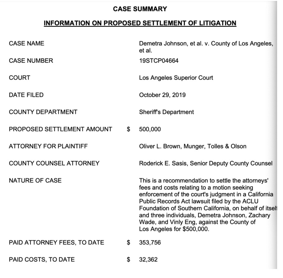 The County settled the Public Records Act case for $500,000, but not before spending nearly $400,000 fighting over the ACLU's SB 1421 records request. Filed on January 1, 2019, the ACLU sought documents disclosable under the law, including records of fatal uses of force, sustained acts of dishonesty, and sexual assault cases involving LASD officers. The requests covered decades of misconduct: fatal force incidents dating back to 1999, dishonesty cases spanning 20 years, and serious use-of-force and sexual assault records from as early as 2009. Instead of complying, the County chose to spend nearly as much resisting transparency as it ultimately paid to settle—a grim reminder of where taxpayer dollars go when accountability is on the line.