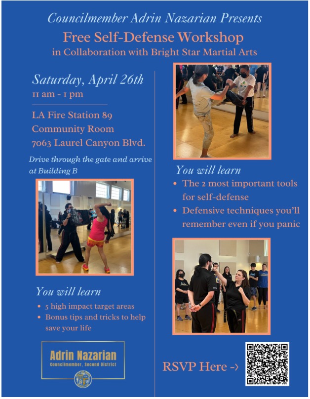 Adrin Nazarian announced via e-blast, that he has hosted more than 90 free self-defense clinics, where thousands of women have learned the basics of self-defense. All genders and ages welcome (over 8).