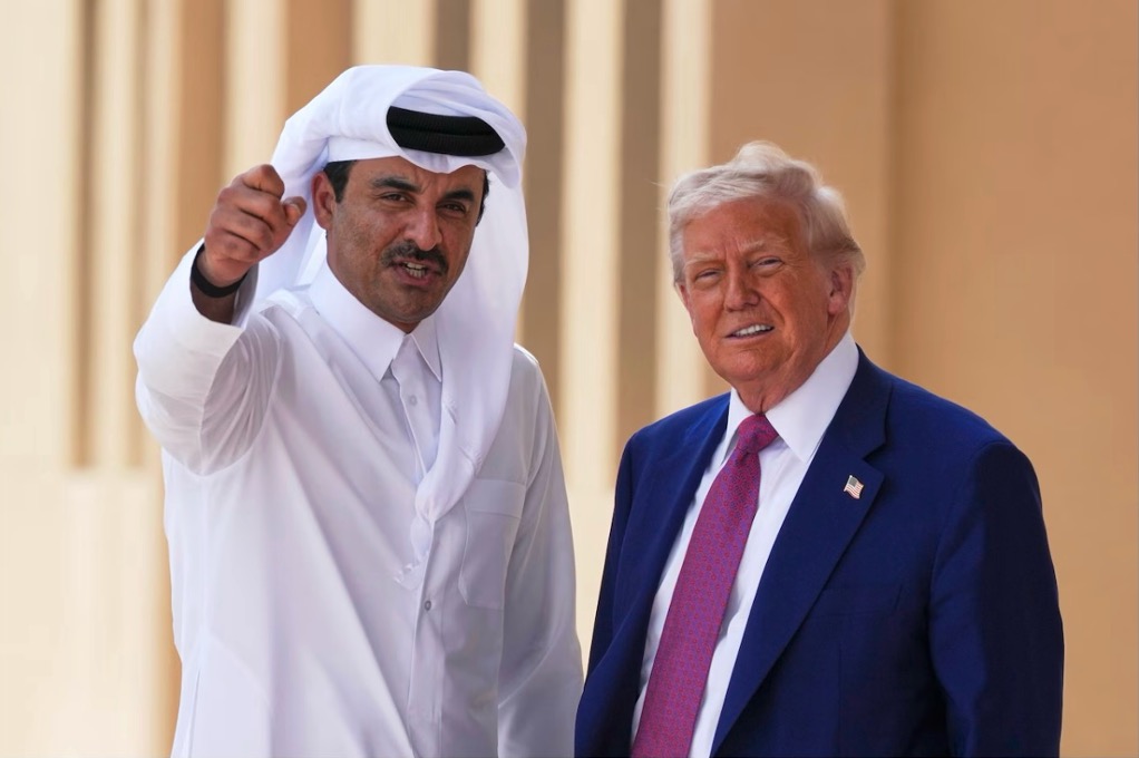 Qatar's Emir Sheikh Tamim bin Hamad Al Thani gestures next to President Donald Trum at Al Udeid Air Base, Thursday, May 15, 2025, in Doha, Qatar. (AP Photo/Alex)