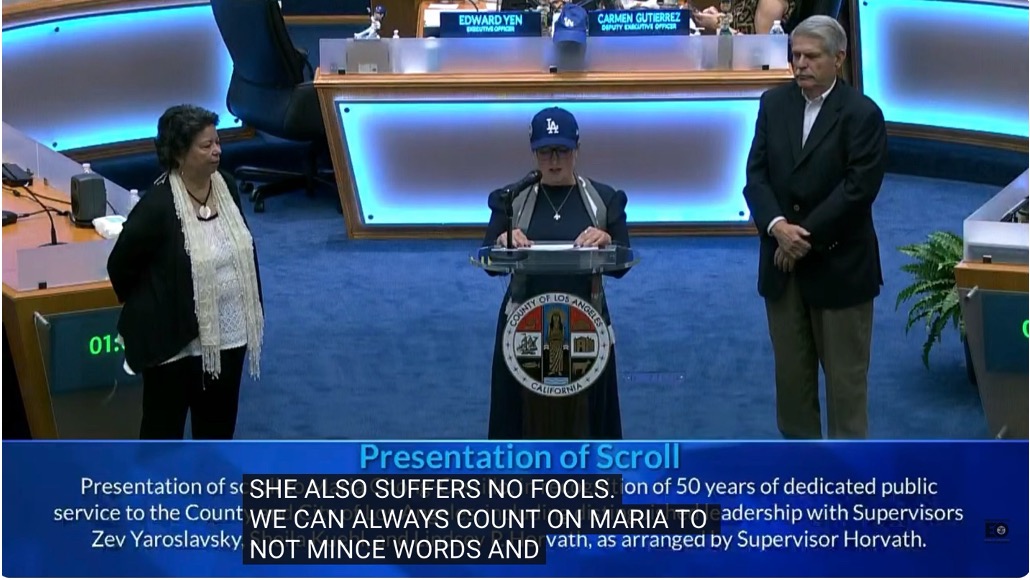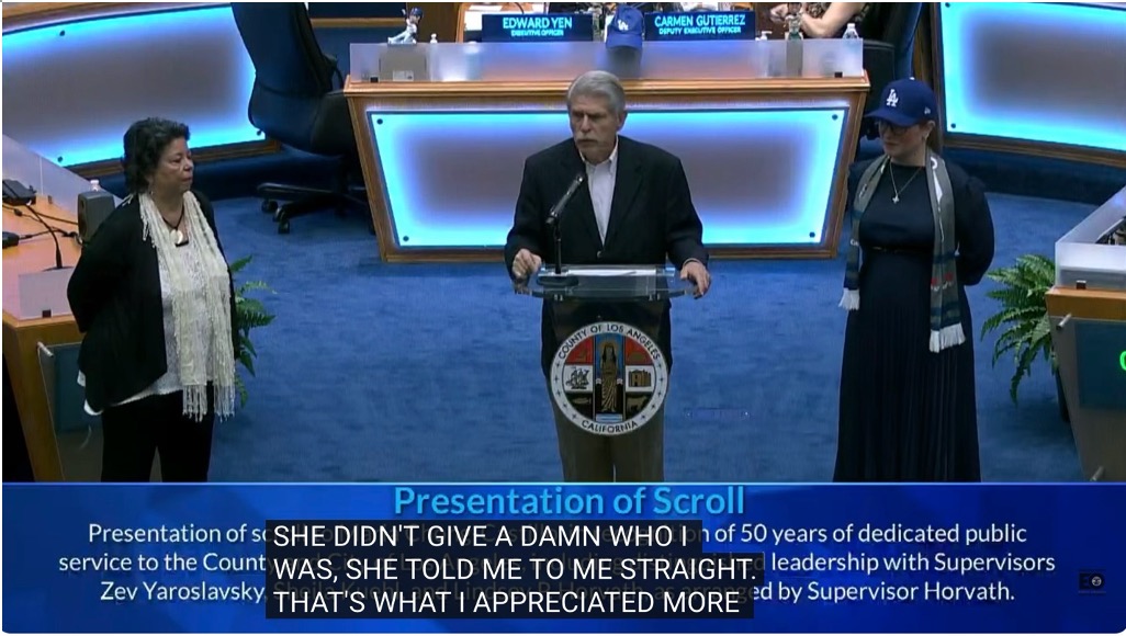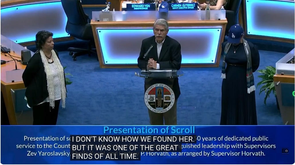 Smart Speaker: Thank you. I share the Board's moral outrage about the feds cutting back on food help for Angelenos — I thought I heard two million kids across the region, but maybe somebody said one million families. It is terrible. And that was a very nice and lengthy series of presentations today. I think the Board of Supervisors deserves credit for remembering that the public sometimes just needs to appreciate Maria Chong-Castillo and other county insiders — great to see Zev Yaroslavsky down here, the big boss. This was such a wonderful homecoming.