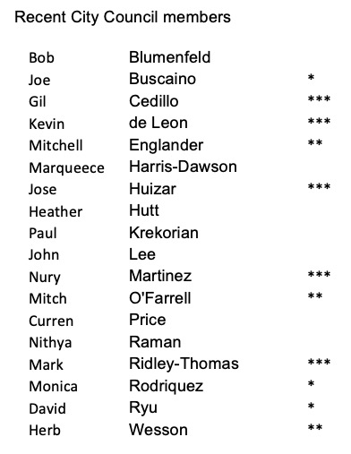 Herb Wesson rated a double asterisk over (1) the allegation that he got his son special treatment (in terms of rent) from a company that he was helping at the zoning level -- a significant misuse of power and (2) that he must have known about the corruption that was going on in the Planning and Land Use committee, the Home of Felonies™.