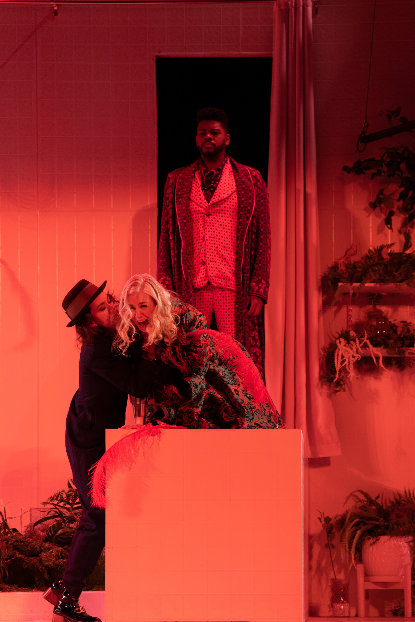 One last thing. From the get go, this opera reminds us that the LBO has no respect for the fourth wall -- as in the male lead walks down into the aisle to collect his volunteer (Tivoli) and pointedly asks her to do a mic check with him. No fooling around with standard operatic conventions. And the volunteer, as The Lover, goes back and forth from her dreamlike operatic voice to her straightforward college girl voice. At one point, she even says, "I want to go back to my seat." The production shifted back and forth from old-time surrealism to comedic-break the fourth wall-natural talk, and the audience laughed heartily as we went along.