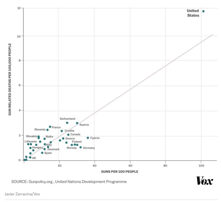There is a good fit showing a strongly positive relationship between a nation owning more guns and that nation suffering increasing numbers of gunshot deaths.