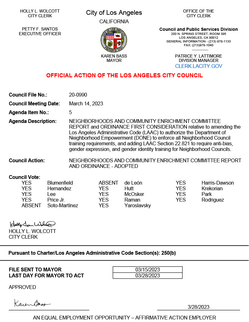 And last, and pathetically least, we have the mayor's signature on the ordinance that tries to make neighborhood council participants into unpaid servants.