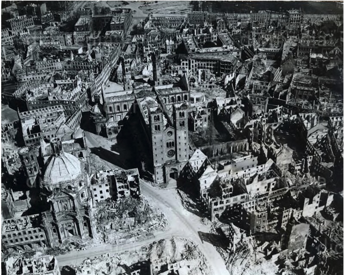 Except for one church, there was not a building left undamaged. For the most part, there were shells of the buildings that had stood there previously. The historical record shows that approximately 90% of the structures were destroyed by allied bombing in WWII.