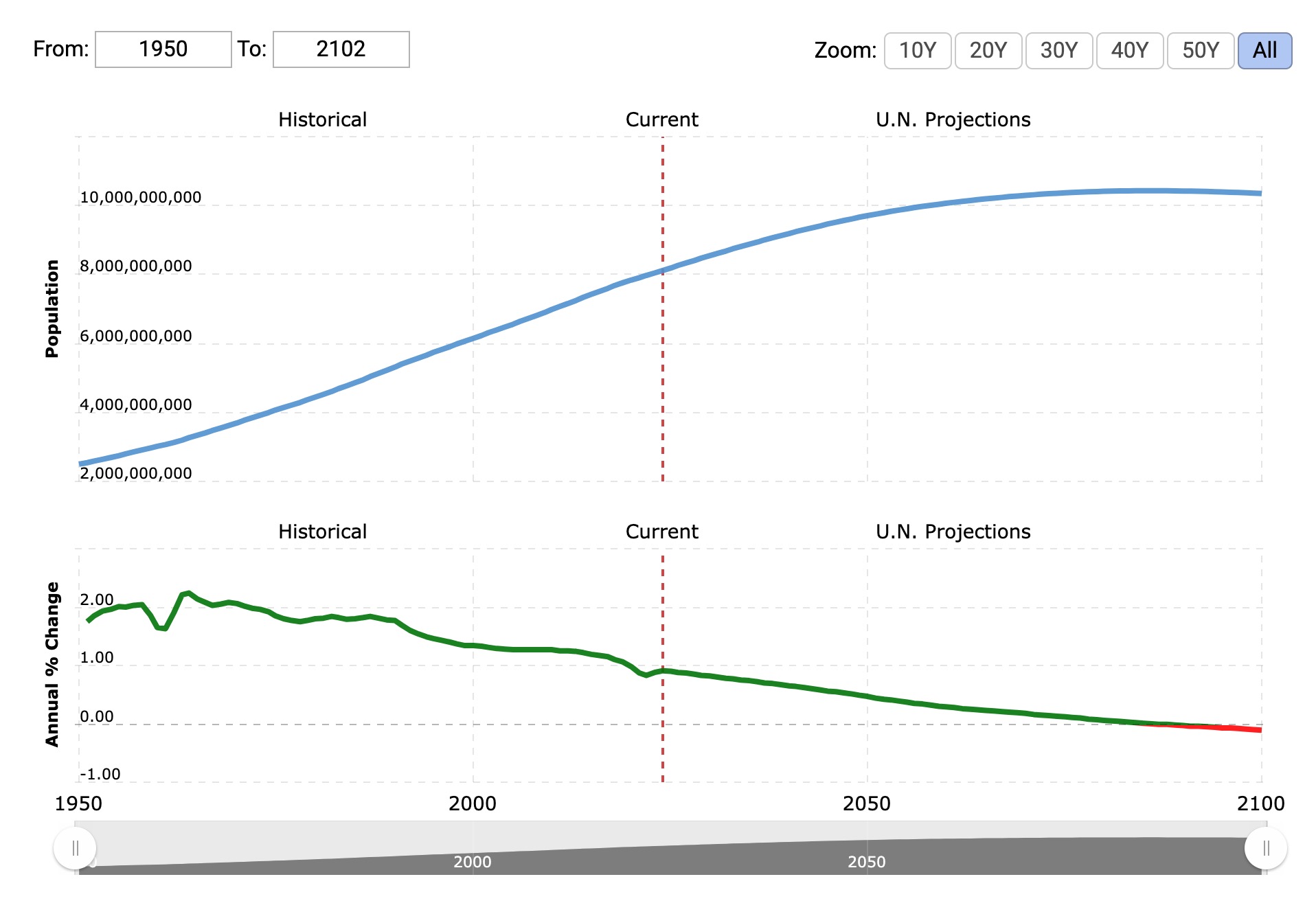 The Macrotrends websites provide the story in graphic form. Back in 1950, world population was right around 2 billion people. It has grown steadily, quadrupling in the interim, so that there are now 8 billion of us.