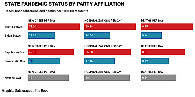 Red states are failing at protecting their citizens from the coronavirus in every measurable outcome. The COVID-19 pandemic hospitalizes and kills residents of MAGA states at twice the rate of states that voted for Joe Biden. Even worse, people who live in states with Republican governors are experiencing a pandemic that is one-and-a-half times worse than states with Democratic governors. Fewer citizens of GOP-led states have been vaccinated, more people catch the virus, more people are hospitalized and more people die.