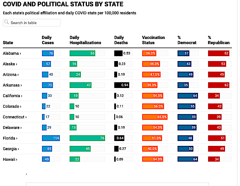 - It’s safer in Bidenville: People who live in states with Democratic governors are statistically more likely to be vaccinated, less likely to be hospitalized and less likely to die than the average American.