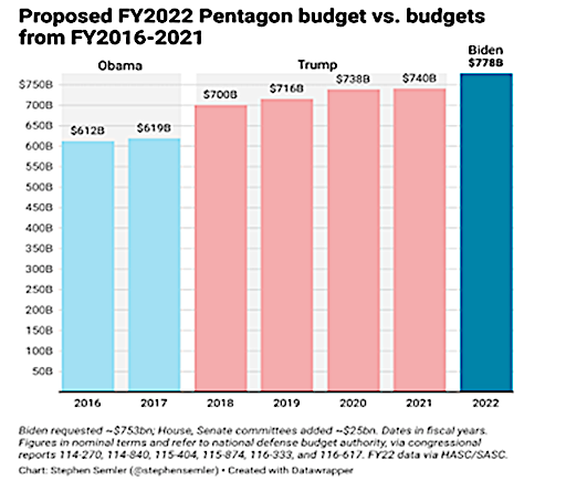 Let’s look at those corporate-Pentagon contracts. Total prime contracting in the current fiscal year (FY) is $447 billion, a jump of $42 billion over FY2020 and over $300 billion since FY2016. These contracts account for about two-thirds of all federal contracting ($682 billion) during those years. Under Biden, large increases continue—and Congress is adding on to his proposals. Thus, for FY2022, Biden Has Proposed$753 billion in military spending, to which Congress has added $25 billion.