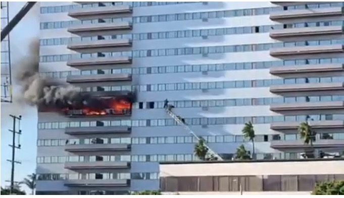 (Bailey Benningfield is a writer for Knock-LA.com which first published this article. A journalism project paid for by Ground Game LA, which has endorsed Erin Darling for City Council. This article was not authorized or paid for by a candidate or a committee controlled by a candidate.) PHOTO: Barrington Plaza high-rise ablaze on January 29, 2020. (LAFD)
