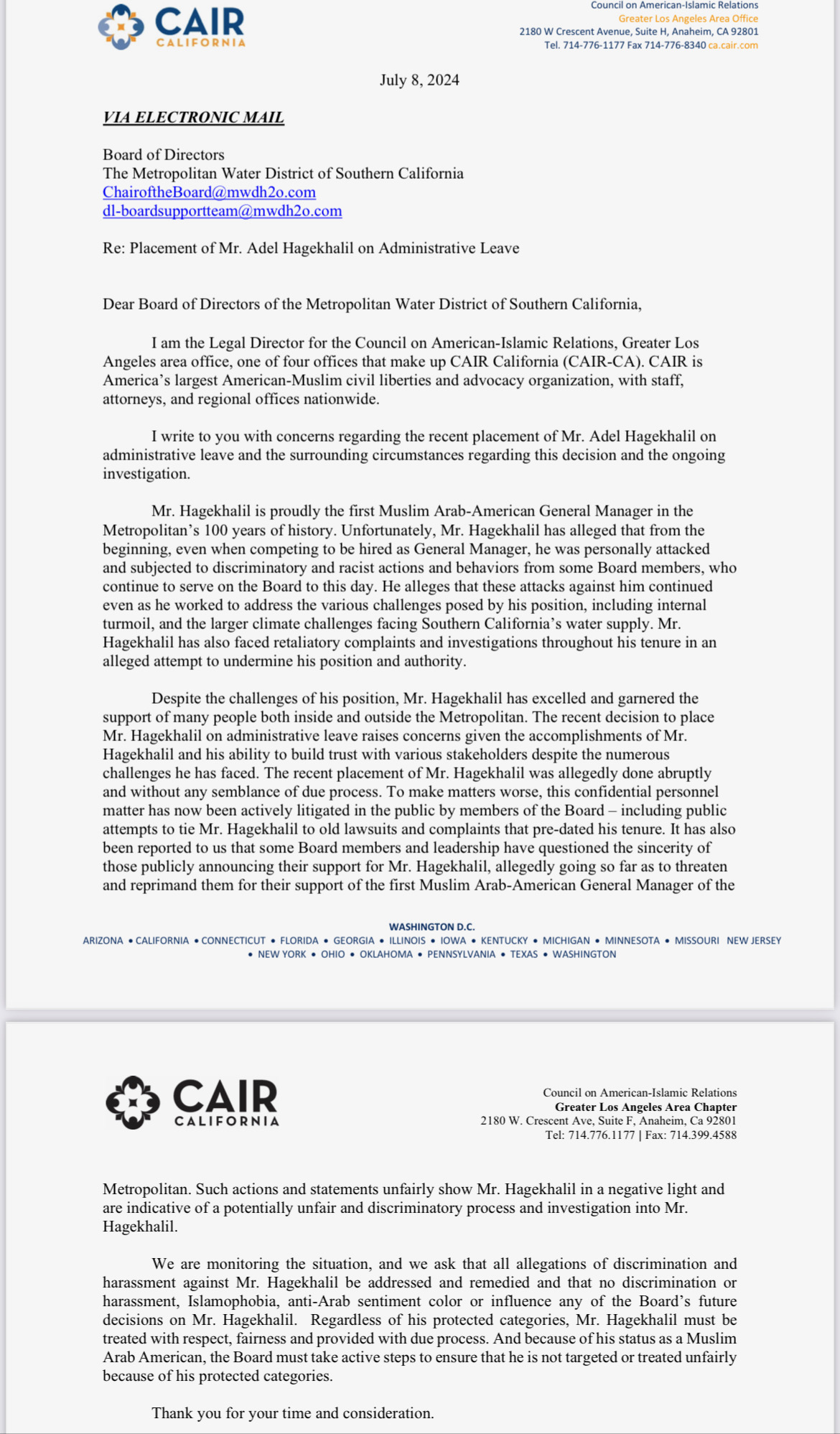 Community organizations also detect the stench of foul play. The Council on American-Islamic Relations (CAIR) wrote to the MWD board on July 8 to protest the mistreatment of the general manager and retaliation against some of his many allies since the special meeting. “Board members and leadership have questioned the sincerity of those publicly announcing their support for Mr. Hagekhalil, allegedly going so far as to threaten and reprimand them for their support of the first Muslim Arab-American General Manager” of the MWD, states the CAIR letter.