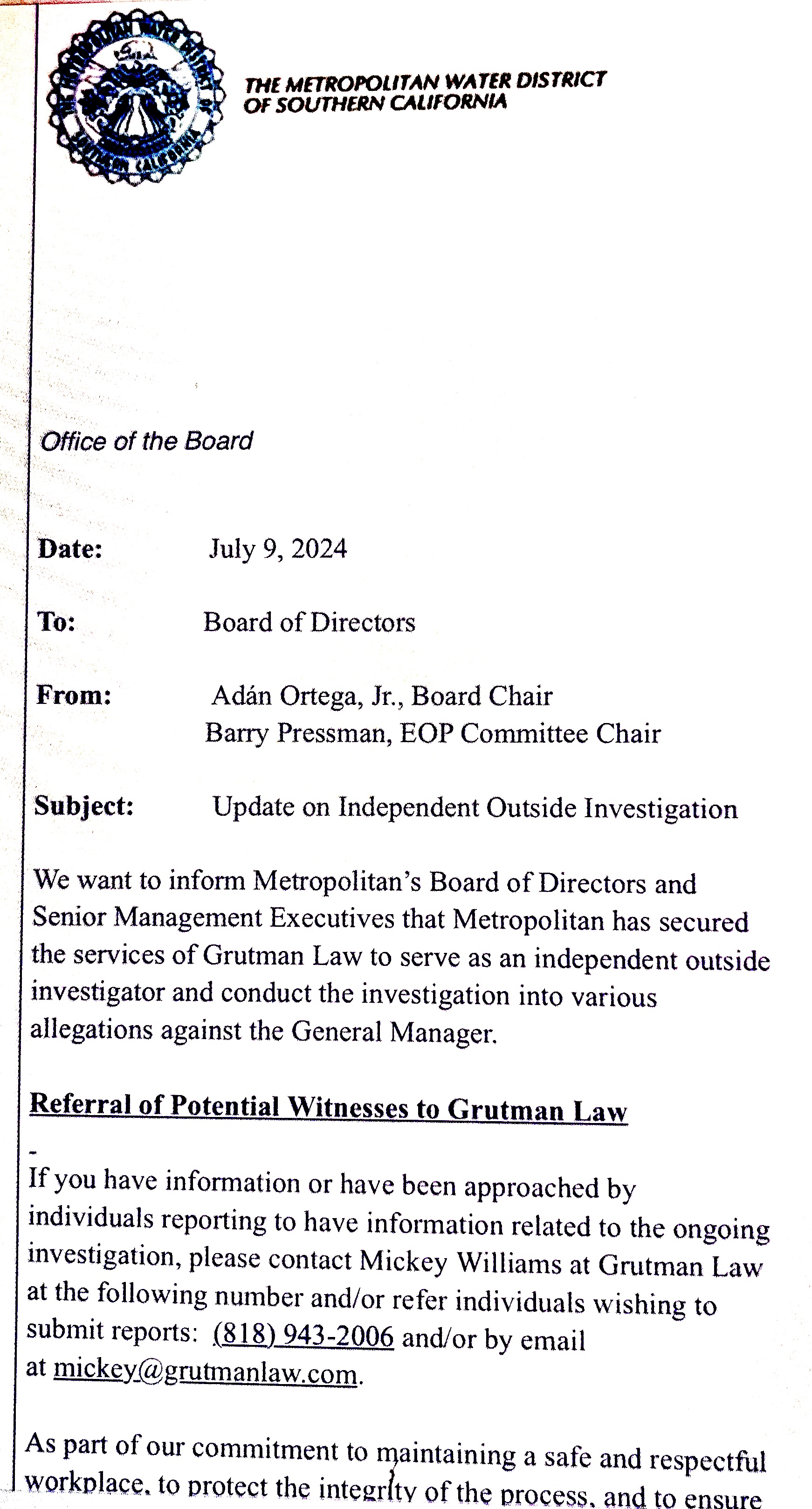 This July 9 memo to the public agency board members of the Metropolitan Water District (MWD), a public agency of local government, from the board chair suggests a fishing expedition to find justification after the fact for the suspension on June 13 of respected MWD general manager Adel Hagekhalil.
