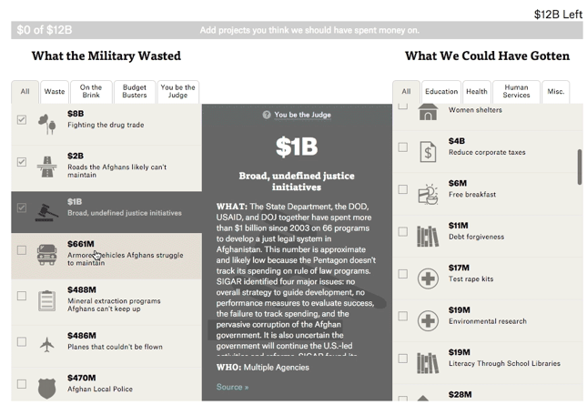A ProPublica investigation found that as of 2015 there were at least $17 billion worth of such projects. To see what kind of projects that money could have paid for here in the U.S. — for example, the testing of the nation’s entire backlog of rape kits or ending dependency on Russia in space — check out this game: