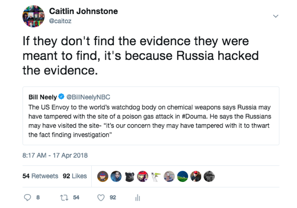 I guess the idea is that this international top-level investigative team on which tremendous credibility has been placed by the western world can be thwarted by Russians showing up with a Hoover and spraying some Febreze in the air like a teenage stoner when mom comes home? I’m not sure, but given the immense dearth of evidence we’ve been seeing in support of the establishment Douma narrative and the mounting pile of evidence contradicting it, it sure does sound fishy.
