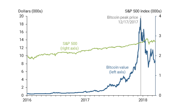 This explosive growth ended on December 17, 2017, when bitcoin reached its peak price of $19,511. Notably these dynamics aren’t driven by overall market fluctuations, as shown by comparison with the Standard & Poor’s 500 stock index.