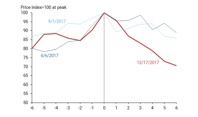 • Bitcoin’s drop following its peak near $20,000 was directly tied to the launch of a futures market, according to new researchfrom the San Francisco Federal Reserve.