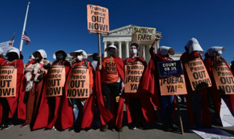 There were vows that women will "walk over broken glass" to vote the fascist out. There were chilling chants from multiple groups of women dressed as handmaidens, protesting extremist Amy Coney Barrett and proclaiming, "In the name of humanity, we refuse to accept a fascist America."