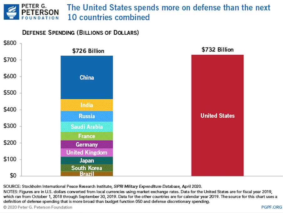 - We have to remain #1. It helps keep morale high, it gives friends confidence in US leadership, and it tells adversaries that they have no hope of surpassing us. We should never be outspent! The chart below shows how, once again, the US will outspend the next 10 countries combined on its military.