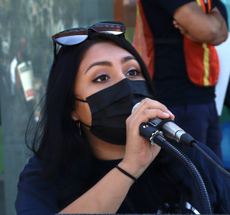 The rally leader was Yesenia Barrera, the Inland Empire Amazon warehouse worker fired without explanation. She is now an organizer with the nonprofit Warehouse Workers Resource Center.