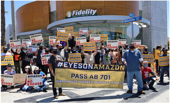 In the Los Angeles area, a small, loud crowd of labor activists, mobilized by the Los Angeles County Federation of Labor, showed up in front of the Fidelity Investment Center in Santa Monica on May 24, two days before the shareholders meeting. “We have a message today to give to Fidelity Investments — Fidelity is a large investor in Amazon,” the rally emcee told the gathering. Warehouse workers are suffering from brutal quotas and terrible injuries, she said.